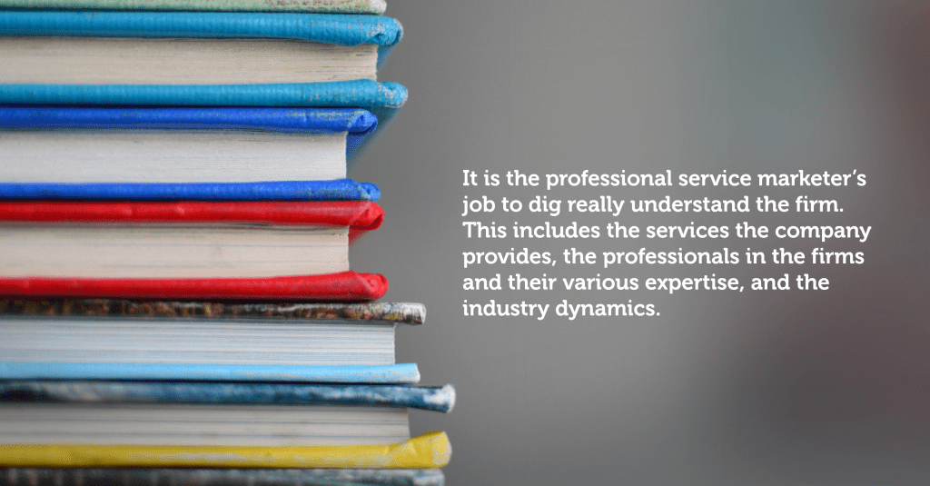 So, how does a professional services marketer develop that deeper understanding of all the firm does, how it does it, and what that means in the market?