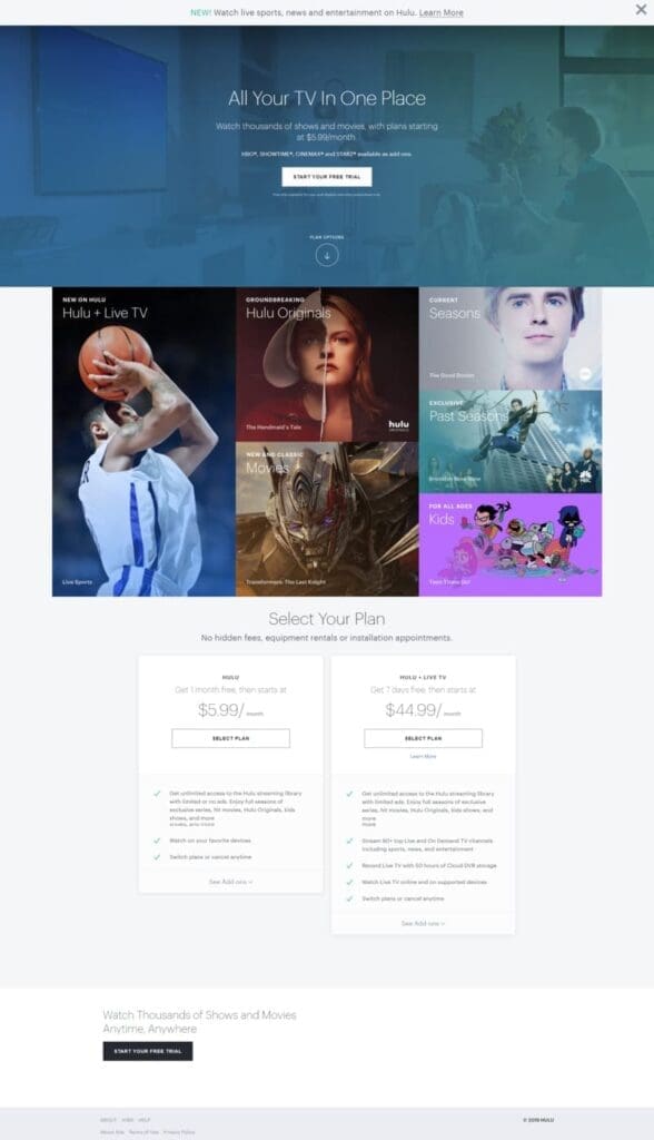 The fact that Hulu has a greater number of packages available (Streaming + Live TV) may have led them to emphasize and give more detail to the content available on their service, while Netflix doesn’t speak at all to: a) what their service is and b) what content they offer. But they emphasize different features of their platform and pricing. For each service, we can better understand what they deem to be important information for prospective customers that will help them in making their decision.