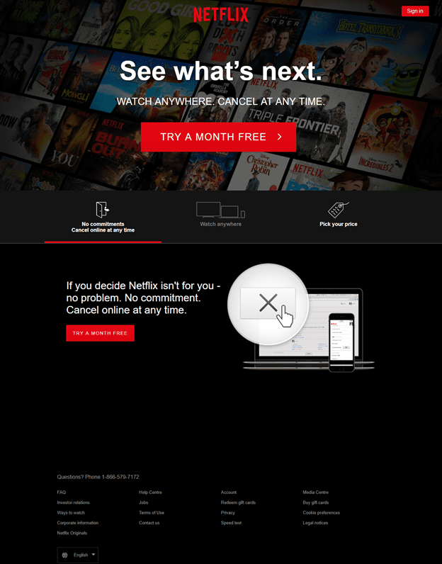 By ensuring all content (social, digital, print, etc.) is advised by or is answering these questions, it will better set the organization up for a long-term, sustainable lead generation strategy. For Netflix and Hulu, we can look at their respective websites to see what their content strategy is and what they’ve determined is the most important information for prospective customers:
