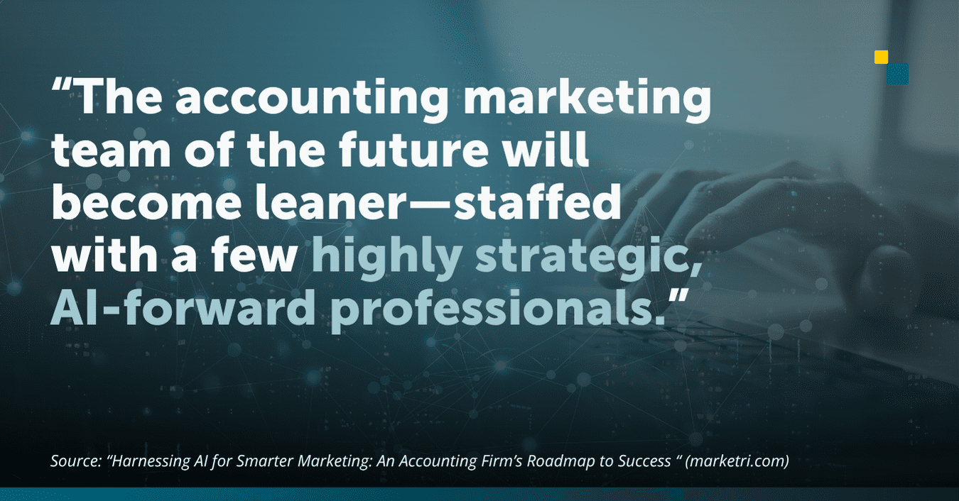 Most mid-sized accounting firms discover that while a solo generalist will no longer suffice, they probably won’t need a big team of specialists as AI becomes integrated into every aspect of marketing. What they WILL need is a lean team of highly strategic marketers who use AI-powered tools to augment their skills and drive effective marketing execution.