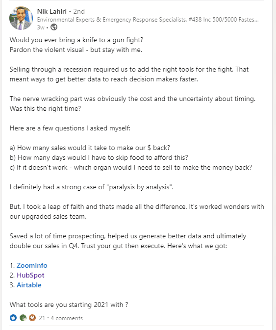 B2B stakeholders like Nik Essel of Essel Environmental shares tips, ideas, and questions with fellow business owners and frequently commented on others’ posts.