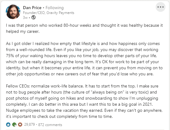 On LinkedIn, CEOs like Dan Price of Gravity Payments shared his personal values and how those have shaped his business policies during the pandemic.