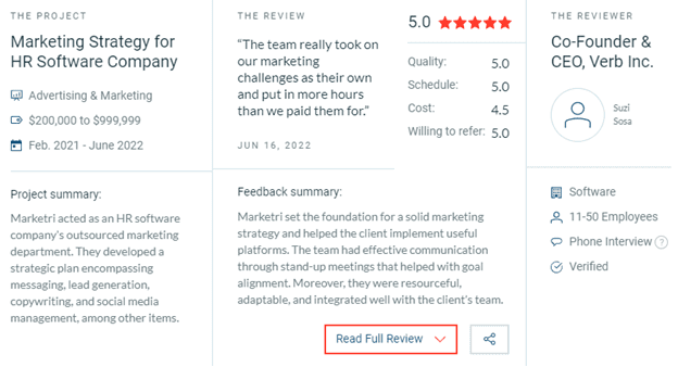 Our Clutch award recognizes the work Marketri does every day to help B2B companies secure new customers and accelerate their growth through strategy-driven modern marketing. While we appreciate the recognition from Clutch.com, we’re most grateful to the clients that entrust their marketing to the Marketri team and especially those who’ve taken the time to share their insights about our work on the Clutch platform.