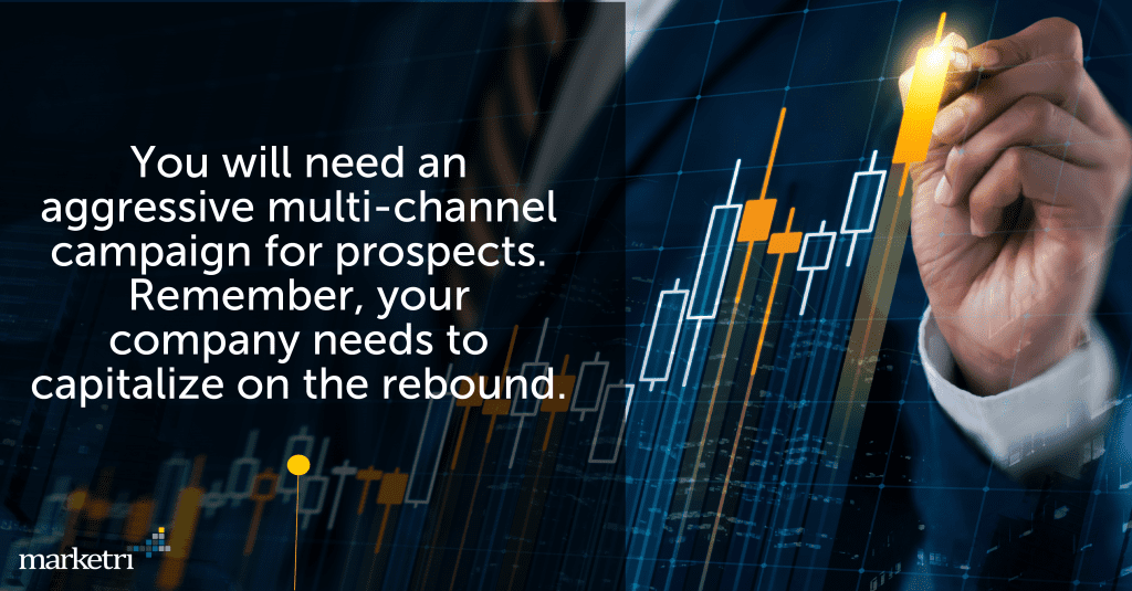 You will need an aggressive multi-channel campaign for prospects. Remember, your company needs to capitalize on the rebound. There is question as to whether the “V” will turn into a “W,” so allocate resources and hit the market hard. Repurpose your customer-facing content if possible, but you’ll need to tap social (paid and earned), PPC (pay per click) and maybe try the public relations route if you have a unique message or story to share. Be sure to have high-converting gated content available, so you can get as many new contacts in your pipeline to nurture as possible.