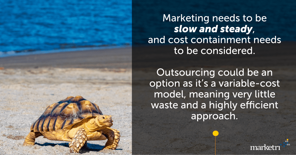 If you have in-house marketers, they need to be “doers” rather than “coordinators.” Marketing doers can perform one or more of the following: plan, write, manage marketing technologies, design, test, and/or measure. Marketing coordinators manage marketing doers that are either internal or external. At a slow-and-steady pace, there is little need for those who coordinate, and those positions should be reimagined or eliminated. If these decisions leave your business without in-house marketing talent, consider outsourced marketing services. It’s a variable-cost model, which enables companies to get the exact skillsets they need, meaning very little waste and a highly efficient approach.