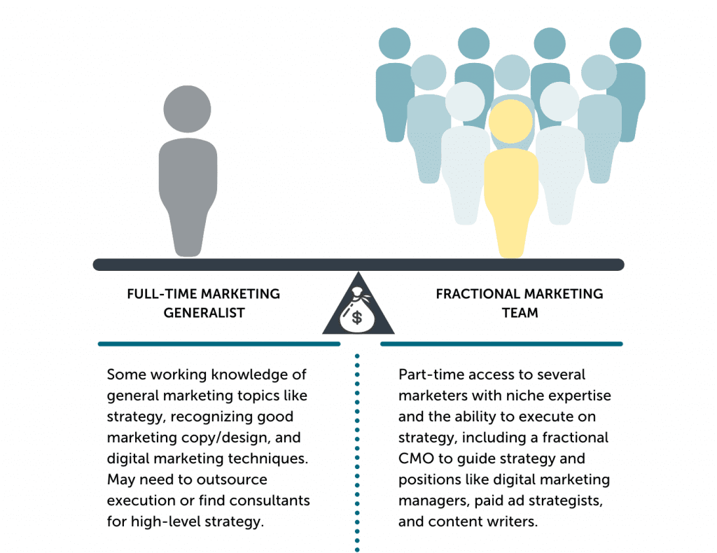 A Fractional CMO is integral to effective fractional marketing…but shouldn’t be the sum total of your team. The best fractional marketing approach is to focus the CMO’s time and energy on high value-add efforts like strategy development and direction, then use tactical specialists for execution (content development, paid search, social media marketing, and so on).