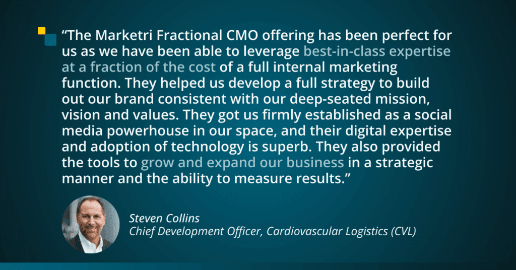 CVL now boasts five top-tier cardiology practices—including what was previously the largest independent cardiovascular practice in the US. Here’s what the head of business development had to say about our impact: “The Marketri Fractional CMO offering has been perfect for us as we have been able to leverage best-in-class expertise at a fraction of the cost of a full internal marketing function. They helped us develop a full strategy to build out our brand consistent with our deep-seated mission, vision and values. They got us firmly established as a social media powerhouse in our space, and their digital expertise and adoption of technology is superb. They also provided the tools to grow and expand our business in a strategic manner and the ability to measure results.”